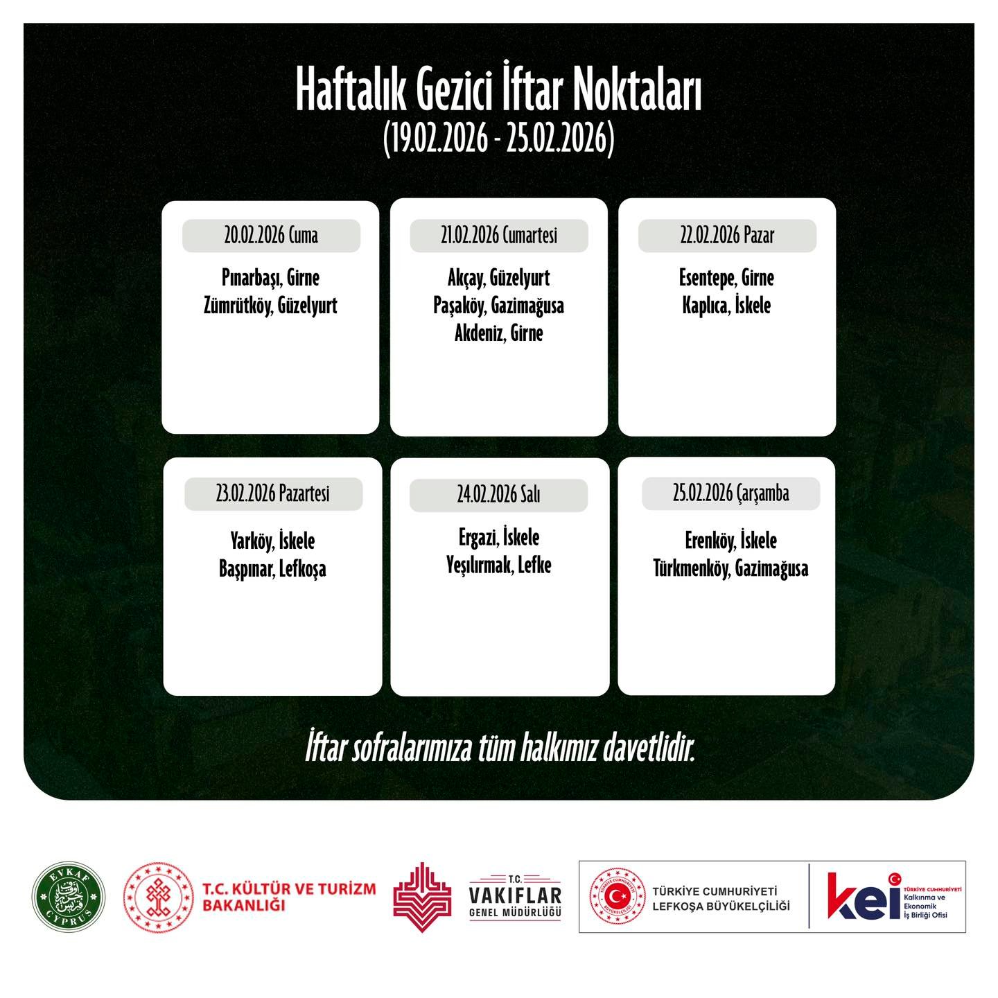 Ramazan ayının bereketini ve paylaşmanın güzelliğini hep birlikte yaşamak için Kıbrıs Vakıflar İdaresi, T.C. Kültür ve Turizm Bakanlığı Vakıflar Genel Müdürlüğü ve T.C. Lefkoşa Büyükelçiliği Kalkınma ve Ekonomik İş Birliği Ofisi tarafından gerçekleştirilen iftar sofralarımıza tüm halkımızı davet ediyoruz.
