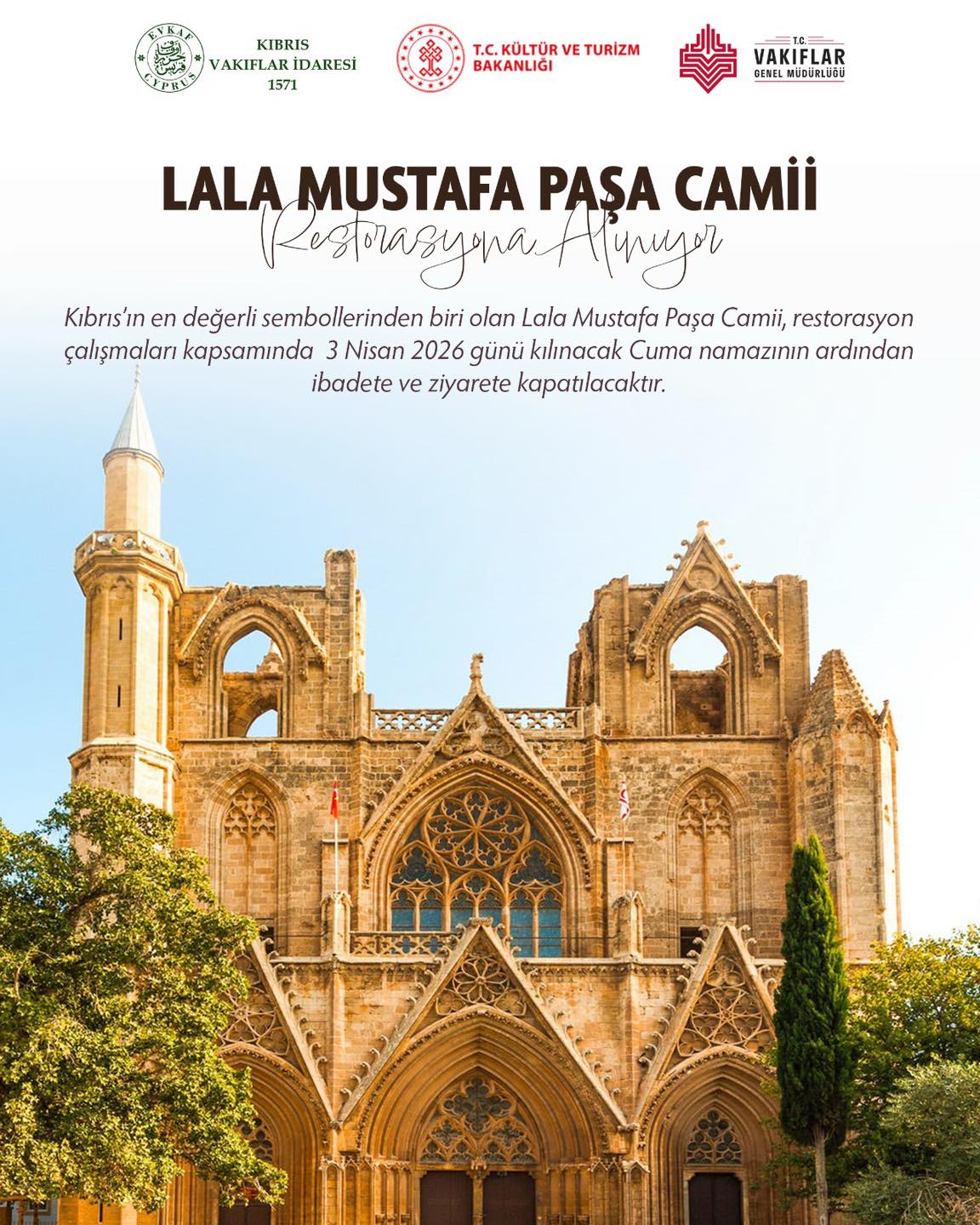 Kıbrıs’ın en değerli sembollerinden biri olan Lala Mustafa Paşa Camii; Kıbrıs Vakıflar İdaresi, T.C. Kültür ve Turizm Bakanlığı ve Vakıflar Genel Müdürlüğü iş birliğiyle restore edilecektir.