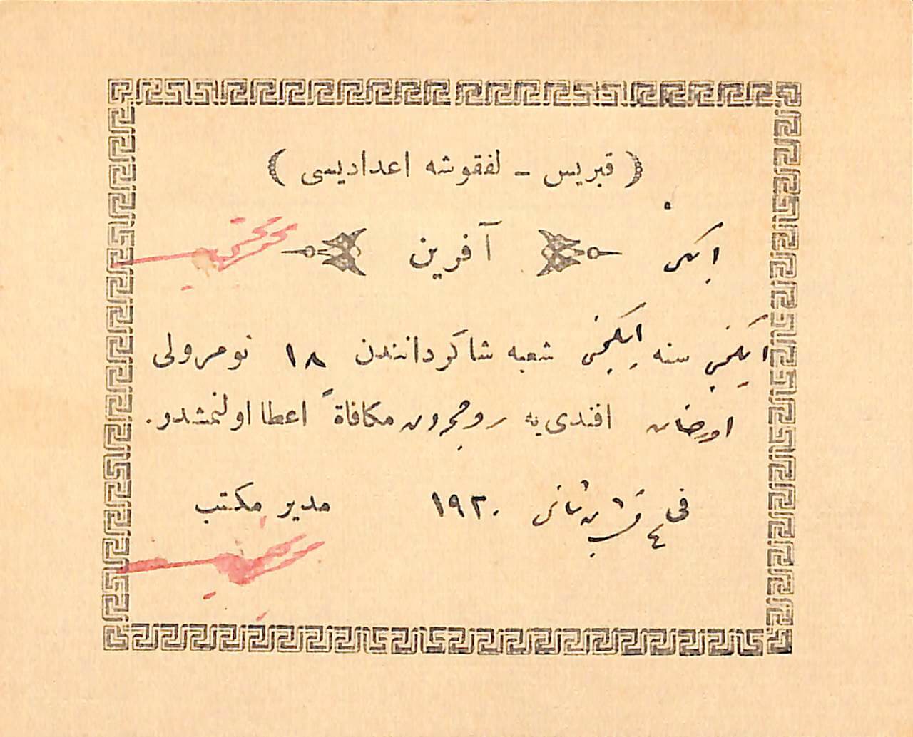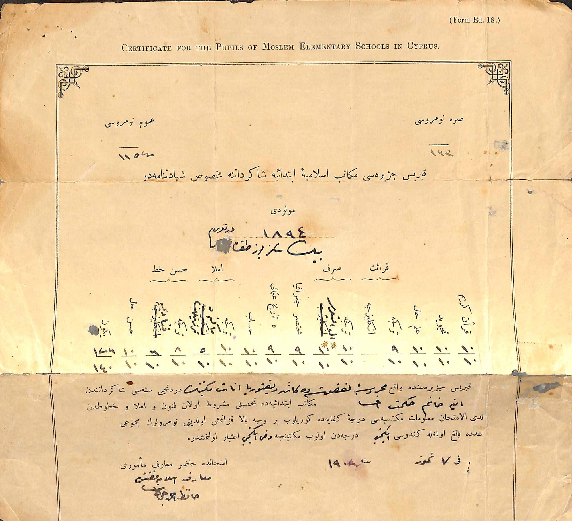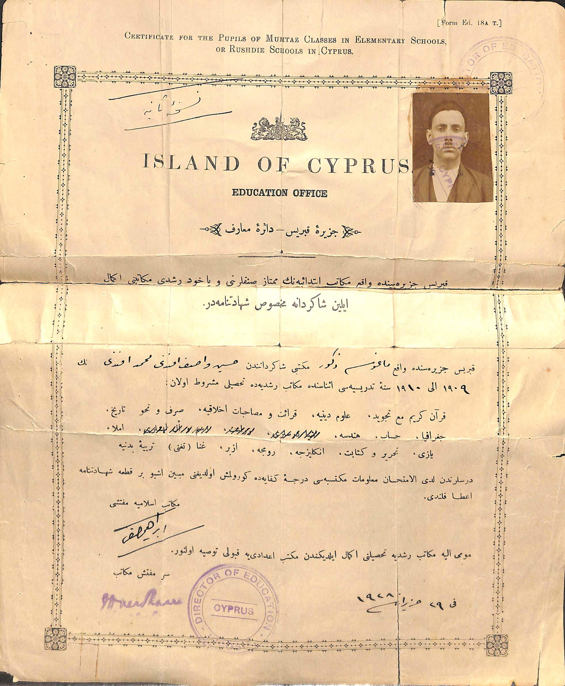 Bir yetişkin Kıbrıs Türkü’ne rüşdiye orta mektebi (Mağusa Zükûr Mektebi) talebesi Hüseyin Vasıfoğlu’nun evladı Mehmet Efendi’ye derslerini başarıyla tamamlandığı için verilen şahadetname.